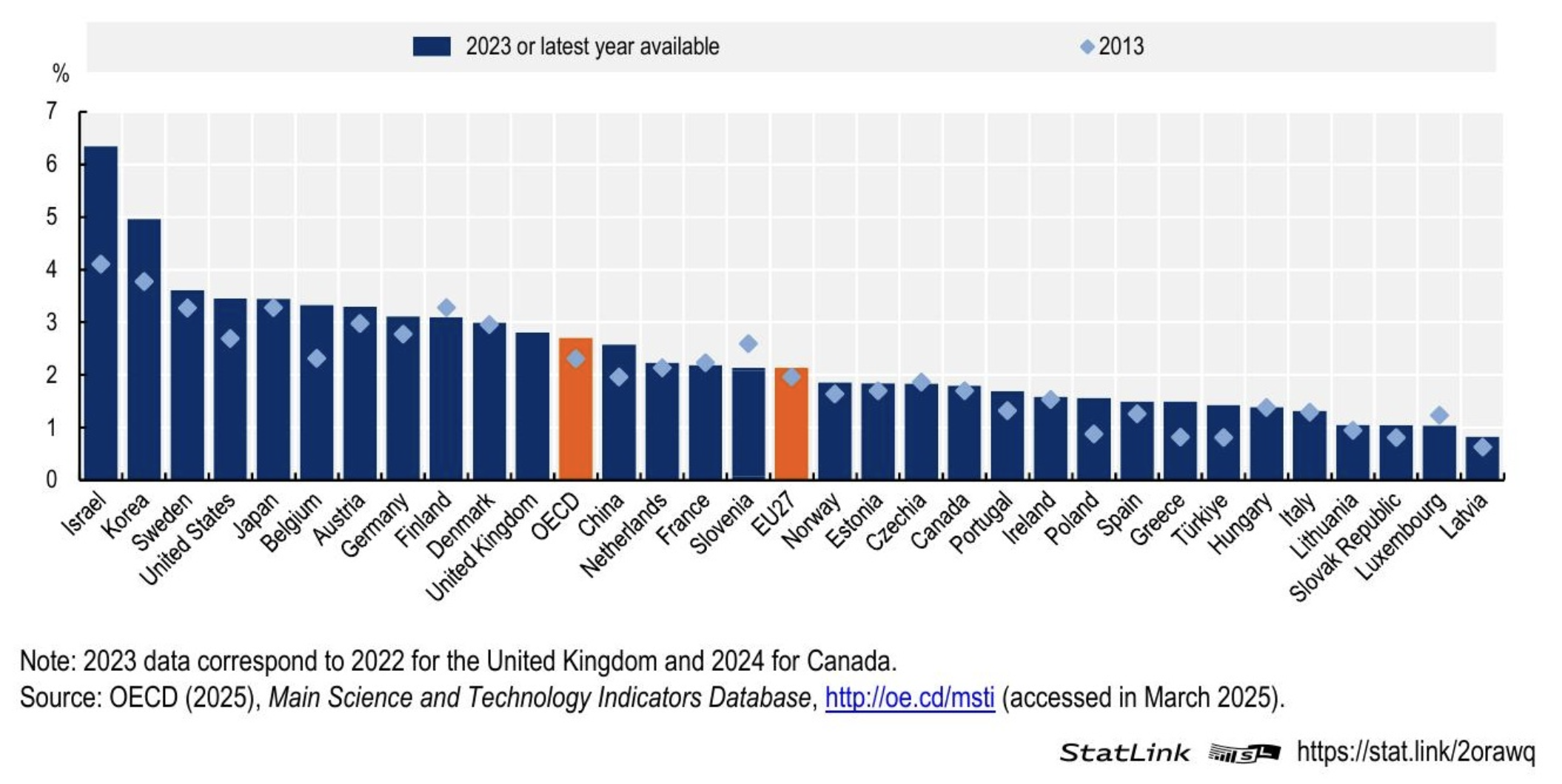 Figura 1 — Intensità di R&S in percentuale del PIL, paesi selezionati, 2013 e 2023. Le barre arancioni evidenziano la media OCSE e l’UE27. Fonte: OCSE (2025), Main Science and Technology Indicators Database.