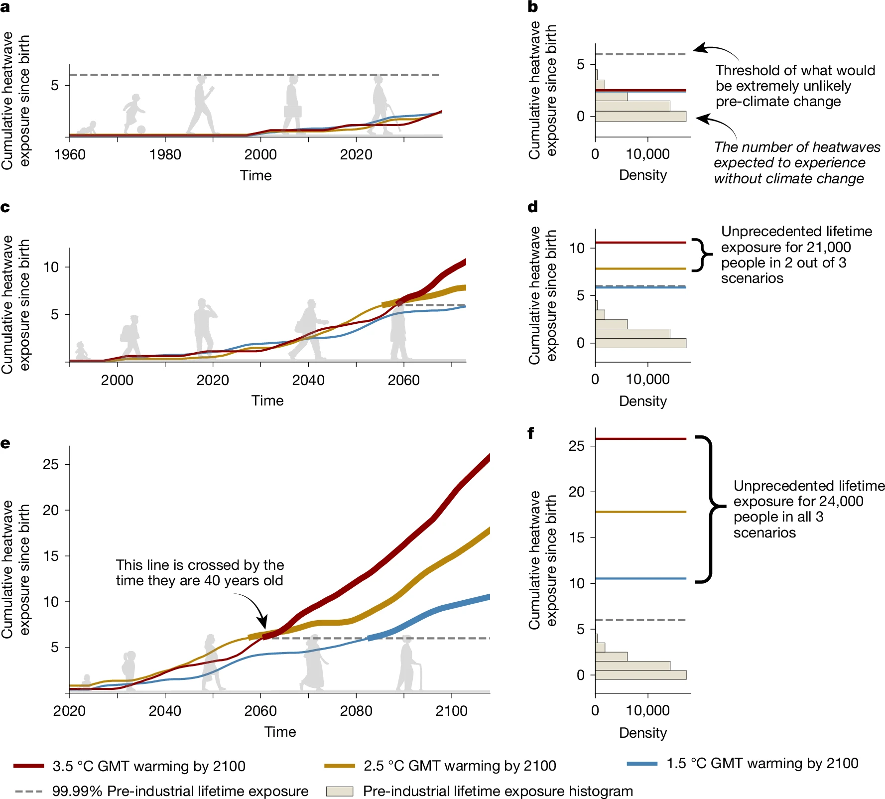 L’immagine tratta da uno dei due studi mostra la differente esposizione a ondate di calore nei tre scenari climatici indicati.